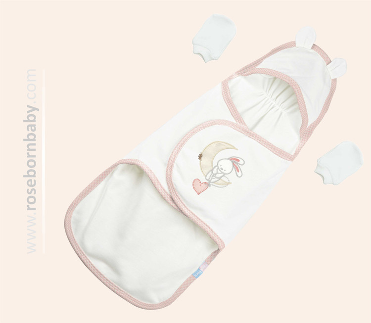 قنداق چسبی مجموعه roseborn از سه تکه تشکیل شده که شامل قنداق، کلاه و دستکش نوزاد است که کامل ترین محصول نسبت به نمونه های مشابه در بازار می باشد .