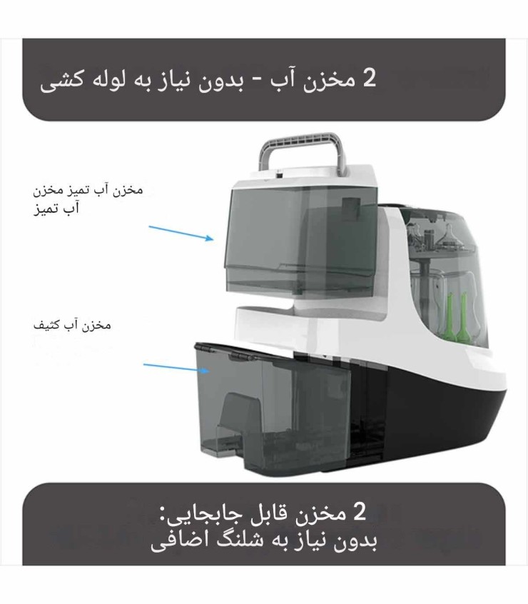 دارای 2 مخزن آب یکی برای آب تمیز و یکی برای آب کثیف(بدون نیاز به لوله کشی آب)